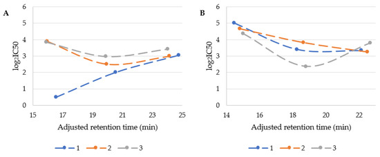 Cytotoxicity (log2IC50) of USCLs (A) and gUSCLs (B) vs. the adjusted retention time.