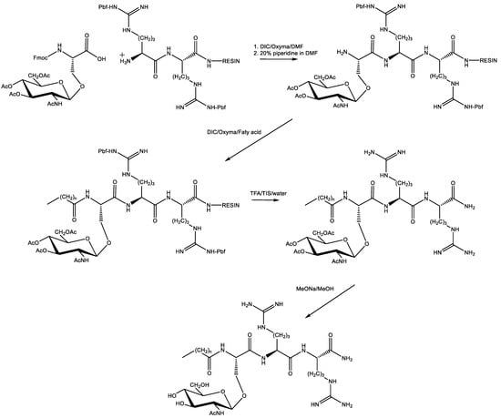 The C16-RR-NH2 an USCL with a well-documented antimicrobial activity was used as a parent molecule for designing a new class of glycosylated ultrashort cationic lipopeptides (gUSCL). Our previous studies indicate that amino acid position and fatty acid chain length are crucial to keep the balance between hydrophobicity and hydrophilicity of the molecule. These are significant features that can affect biological activity [22]. In general, two main groups of USCLs were studied—basic lipopeptides and their analogs with an O-glycosylated serine residue. The straight-chain fatty acids (C14, C16, C18) were conjugated to Nα-amino group of N-terminal amino acid residue. Serine/glycosylated serine residue were placed in three different positions—“SRR”, ”RSR”, and ”RRS”. In effect, each group contained 9 compounds (18 in total). USCLs were synthesized using the solid phase and Fmoc/tBu chemistry. For the synthesis of gUSCLs, N-(9-fluorenylmethoxycarbonyl)-(2-acetamido-2-deoxy-3,4,6-tri-O-acetyl-β-d-glucopyranosyl)-l-serine (Fmoc-Ser(ß-d-GlcNAc(Ac)3)-OH) was synthetized using the method reported by Carvalho et al. [16] with slight modifications. To a solution of 2-acetamido-2-deoxy-3,4,6-tri-O-acetyl-α-d-glucopyranosyl chloride [17] in 1,2-dichloroethane, Fmoc-Ser-OH and HgBr2 in 1,2-dichloroethane was added dropwise. Then, the mixture was heated at 80 °C for 2 h. Additional portion of 2-deoxy-3,4,6-tri-O-acetyl-α-d-glucopyranosyl chloride was added after 1 h. After purification through extraction and reverse phase high-performance liquid chromatography (RP-HPLC), the product was obtained in satisfactory yield (ca. 50%). The reaction was repeated several times to provide a sufficient amount of the product (Scheme 1). Its structure was confirmed with MS and 1HNMR analyses. The results were consistent with those reported by Carvalho et al. [16], including β configuration of anomeric carbon atom with a coupling constant J1–2 of 8.5 Hz.