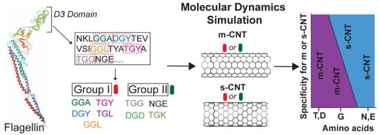 In this study, the modelling of a tripeptide library from the D3 domain of flagellin, the specific interactions of these tripeptides with both metallic (12, 12) and semiconducting (5, 15) CNTs, and their quantification based on the selectivity of tripeptides is performed using molecular dynamics (MD). The driving forces behind such interactions are largely Van Der Waals and hydrophobic interactions [20,21,22,23,24,25,26]. MD simulations of nine tripeptides, each with a different combination of flanking residues, were used to develop an optimal tripeptide sequence library to differentiate between the two forms of CNTs. The specific role of individual amino acids was identified in the tripeptides during their selective interactions with either metallic (12, 12) or semiconducting CNTs (5, 15) used in this study. Each tripeptide in the library contained a middle glycine residue as a common unit flanked by different amino acids on either side. The role of glycine in its selectivity for metallic CNTs [22] is explained based on the effects of the flanking residues. The data analysis shows that the tripeptide library used in this study has huge implications in differentiating the semiconducting and metallic CNTs based on the interactions with the flanking residues. Furthermore, not only glycine but also the flanking residues play a crucial role in sorting the CNTs. This study has importance and ramifications in developing an easier method of de-bundling and separating CNTs when present in a mixture. It eliminates the need of developing a phage library of random peptides to study peptide–CNT interactions. Figure 1 shows the basic scheme of the nine tripeptides used in this study.