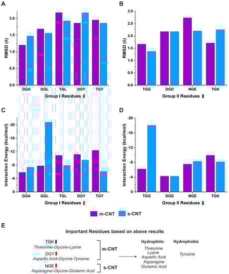 Change in average RMSD per frame for the tripeptide combinations in (A) Group I and (B) Group II with respect to the metallic and semiconducting CNTs. (C,D) show the average interaction energies per frame after the stabilization of RMSD for the two groups with respect to both CNTs. (E) The important residues based on the results of RMSD and interaction energy of the whole tripeptides with CNTs.
