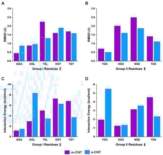 (A,B) Change in average RMSD for the sidechains of the flanking residues and the (C,D) interaction energy between the sidechains of the flanking residues and the CNTs for Group I and II tripeptide combinations.