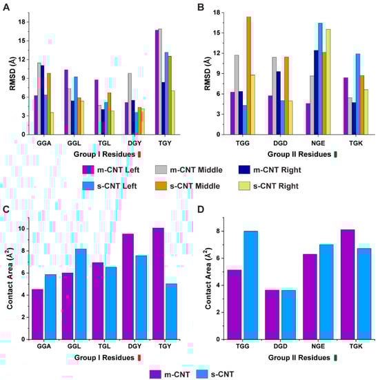 Individual average RMSD analysis for the left (L), middle (M), and right (R) residues of the tripeptides with respect to the metallic and semiconducting CNTs for (A) Group I and (B) Group II set of tripeptides. (C,D) show the contact area of the two groups of tripeptide combinations with the metallic and semiconducting CNT.