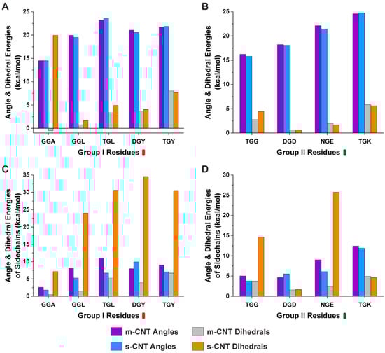 Conformational energies in terms of angle and dihedral energies for (A,B) tripeptide combinations and (C,D) sidechains of the tripeptides for groups I and II with respect to metallic and semiconducting CNTs.