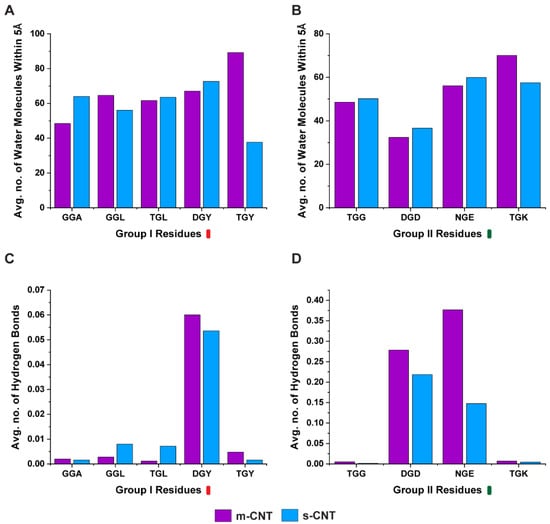 Intermediate water molecules between the biological macromolecules and nanoparticles play a crucial role in stabilizing the complex, therefore in this study a detailed analysis of the number of water molecules (Figure 6A,B) between the tripeptides and CNTs was performed. Additionally, the number of hydrogen bonds (Figure 6C,D) formed by these intermediary water molecules were quantified. Logically, for a larger number of interfacial water molecules, the number of hydrogen bonds for these molecules also should be large. The tripeptide combination ‘GGL’, ‘TGY’, and ‘TGK’ had a larger number of interfacial water molecules for metallic CNT, while ‘GGL’ had a lesser number of hydrogen bonds for metallic CNT. ‘TGY’, and ‘TGK’ had larger number of hydrogen bonds. Similarly, ‘GGA’, ‘TGL’, ‘DGY’, ‘TGG’, ‘DGD’, and ‘NGE’ had a larger number of interfacial water molecules for semiconducting CNTs, the number of hydrogen bonds are lesser, except for ‘TGL’. This seems to indicate that the ability of the interfacial water molecules to form hydrogen bonds may have a direct relationship with the interaction energy and stability profile of the two interacting molecules.