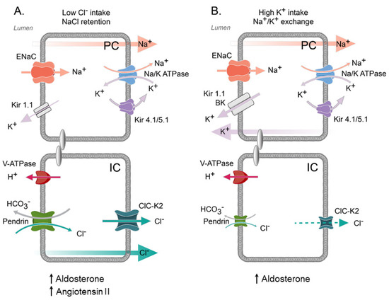 - Tomilin, V.N.; Zaika, O.; Subramanya, A.R.; Pochynyuk, O. Dietary K+ and Cl− independently regulate basolateral conductance in principal and intercalated cells of the collecting duct. Pflügers Arch. Eur. J. Physiol. 2017, 470, 339–353. [Google Scholar] [CrossRef]
