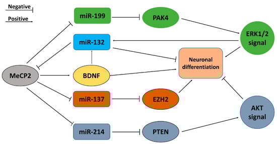 Mellios and colleagues found that miR-199 and miR-214 are strongly upregulated in patients with Rett syndrome and MeCP2-deficient neuronal progenitor cells (NPCs), and also found that they are important effectors in early neuronal development through multiple effects on the AKT and ERK signaling pathways [31]. In MeCP2-deficient NPCs, upregulated miR-199 and miR-214 have different regulatory effects on the ERK and AKT signaling pathways. The upregulation of miR-214 decreases the expression of PTEN, whereas the upregulation of miR-199 significantly inhibits the expression of PAK4 in MeCP2-deficient neurons. In the hippocampus of MeCP2-deficient mice, miR-199/214 is upregulated and expression of targets PAK4 and PTEN decreases, thus resulting in differential regulation of upstream ERK and AKT signaling pathways in neurogenesis on the basis of inactivation of the ERK pathway and activation of the AKT pathway. Moreover, changes in the expression of miR-214/PTEN and miR-199/PAK4 in 3-week-differentiated neurons derived from iPSCs led to both ERK and AKT activation, thus indicating a compensatory effect on the activation of the two central molecular centers [31]. As shown in Figure 1, miR-132, MeCP2, miR-199/214, and the ERK and AKT pathways form a regulatory loop modulating the differentiation of hippocampal NSCs.