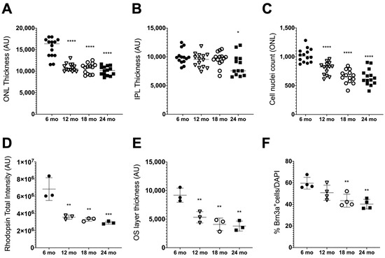 Evaluation of retinal layers in old mice. (A) Retinal thickness quantification of the outer nuclear layer (ONL) and (B) inner plexiform layer (IPL). (C) DAPI nuclei quantification of the ONL per field of view from mice at the indicated age (n = 14). (D) Quantification of the total intensity of the outer segment (OS) layer by immunofluorescence staining with Rhodopsin 1D4 in retinal sections. (E) Thickness measurements of the OS layer based on Rhodopsin 1D4 staining in retinal sections (n = 3). (F) Quantification of Brn3a-positive retinal ganglion cells (RGC) assessed by Brn3a immunofluorescence on retinal sections (n = 4). All quantification data are presented as mean ± SD. Mice of 12 (∇), 18 (○) and 24 months old (mo) (■) were compared to 6 mo (●) mice using an ordinary one-way ANOVA multiple comparison test (* p < 0.05, ** p < 0.01, *** p < 0.001 and **** p < 0.0001).