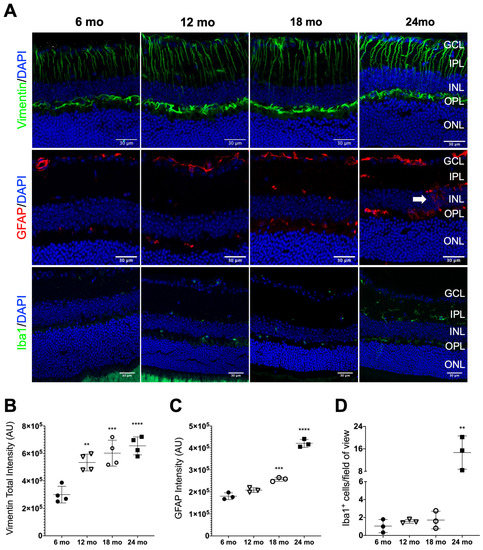 We evaluated the levels of intermediate filament proteins vimentin and GFAP in normally aging mice. Immunofluorescence analysis showed vimentin fibers extending from the GCL throughout the IPL and INL, reaching the OPL (Figure 2A). With aging, this intermediate filament protein was clearly increasing, which was observed in the representative confocal images, especially when comparing 24-month-old and 6-month-old mice (Figure 2A). The pattern was confirmed by the quantification of the vimentin total signal intensity, which was significantly increased in 12-, 18- and 24-month-old mice when compared to the control (Figure 2B).