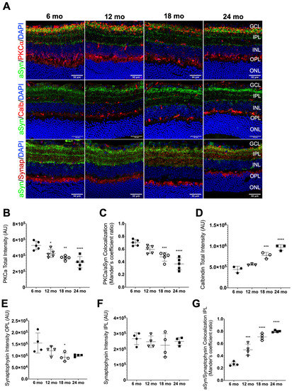 Regarding aSyn colocalization with PKCα, we observed a decrease in the colocalization between these proteins when comparing 18- and 24-month-old mice with 6-month-old mice (Figure 5C). However, it is important to keep in mind that the total intensity of the aSyn signal also declines as the retina becomes older (Figure 3B) and that rod bipolar cells are functionally affected in age-related conditions [63].