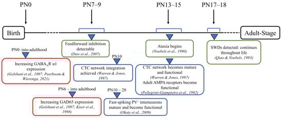 - Seo, S.; Leitch, B. Postnatal expression of thalamic GABAA receptor subunits in the stargazer mouse model of absence epilepsy. Neuroreport 2017, 28, 1255–1260. [Google Scholar] [CrossRef]