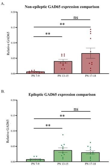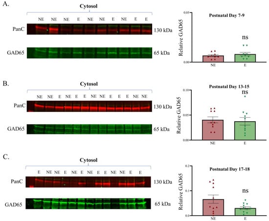 - Kiser, P.J.; Cooper, N.G.; Mower, G.D. Expression of two forms of glutamic acid decarboxylase (GAD67 and GAD65) during postnatal development of rat somatosensory barrel cortex. J. Comp. Neurol. 1998, 402, 62–74. [Google Scholar] [CrossRef]
