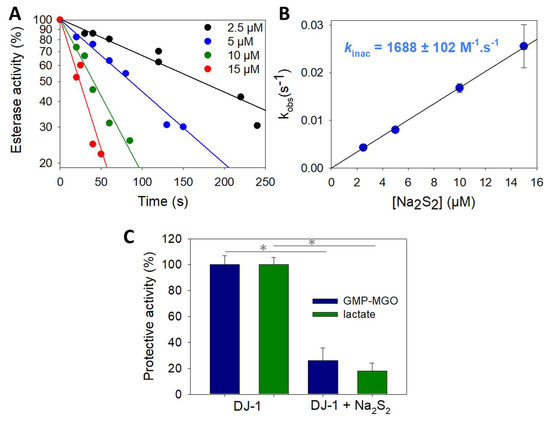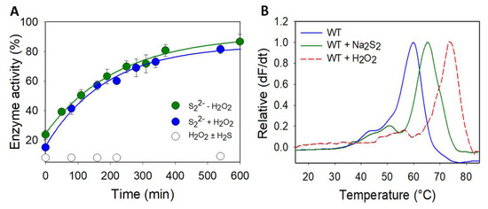 Therefore, contrary to other proteins in which the sulfenic acid is stabilized and may be quenched by hydrogen sulfide [65,82], the persulfidation of DJ-1 via the formation of its sulfenic acid (Scheme 2, red arrow) is, in our opinion, less likely than its reaction with polysulfides (Scheme 2, green arrow). This view is supported by our experiment showing that DJ-1 is fully and irreversibly inhibited in the presence of equimolar concentrations of H2O2 and H2S.