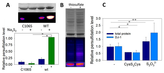 Finally, we investigated whether recombinant DJ-1 is endogenously persulfidated when overexpressed in E. coli and if its persulfidation level could be influenced by sulfur compounds. When DJ-1 is overexpressed under standard conditions, persulfidation is clearly detected by in gel fluorescence assay [30] (Figure 5C). The addition of 25 mM sodium thiosulfate to the culture medium after induction not only increases DJ-1 but also the global proteins’ persulfidation levels (expressed as the Cy5/CBB signal ratio, which we found more accurate in our experiments than the Cy5/488 signal ratio proposed previously [30]), in contrast to the addition of 1 mM cysteine trisulfide, which had the opposite effect. It must be noted that endogenous persulfidation was also unexpectedly detected when overexpressing the mutant C106S in E. coli (Figure S2B).