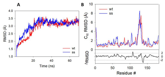 RMSD plots during 70 ns MD simulations–(A) RMSD plots obtained for the protein backbone of the wild-type (blue) and persulfidated (red) DJ-1. (B) Cα-RMSD of the amino acid residues from the wt (blue) and persulfidated (red) DJ1-1. RMSD plots represent the average of the RMSD value of each monomer.