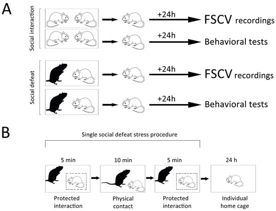 Schematic illustration of the experimental design. (A) Two groups of male Sprague Dawley rats (intruders) were exposed to different behavioral paradigms. In the first one (control condition), a subject was reintroduced to its cage mate (Sprague Dawley male), whereas in the second paradigm (social defeat), a rat was placed into the cage of an aggressive Long Evans male for the same period of time (20 min). 24 h after these procedures, intruders were subjected to either FSCV study or behavioral assessments (sucrose consumption, open field test and forced swim test). (B) During the first and last segments of the social defeat session, rats could interact through a wire mesh inset cage only. In the second segment of the paradigm, animals were allowed to physically contact with each other. Following this procedure, subjects were returned to their home cages for 24 h.