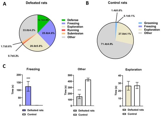 Rat behavior displayed during social defeat stress. Behaviors were characterized as defensive, freezing (rat does not move), explorative (rearing and sniffing), running, submissive (rat lying on the back), or other (walking, standing). (A)–Distribution of behaviors exhibited by intruder rats during social defeat stress presented as a percent of total session time exposure (n = 8), (mean ± SEM). (B)–Distribution of behaviors exhibited by intruder “control” rats during a 20 min exposure to a non-aggressive counterpart presented as a percent of total session time (n = 8), (mean ± SEM). (C)–Effect of social defeat stress on the display of select behaviors compared to non-stressed controls. Data presented as mean ± SEM, Unpaired two-tailed t-tests or Mann–Whitney U test was used, (n = 8 per group), *** p ≤ 0.0006.