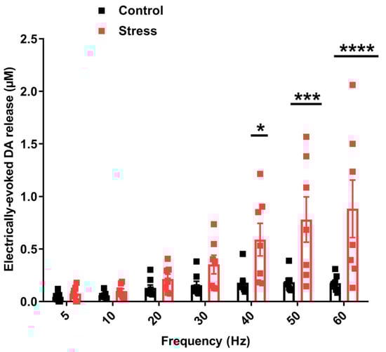 Electrically evoked dopamine is released in a frequency-dependent manner 24 h after social defeat stress exposure. Dopamine efflux in the NAc of defeated (n = 7) and control (n = 8) rats was recorded following VTA electrical stimulation (1 s, 5–60 Hz, 5–60 pulses, current 330 µA). Stimulations were taken every 10 min. Data are presented as mean ± SEM, repeated measures two-way ANOVA; * p < 0.05; *** p 0.001; **** p < 0.0001.