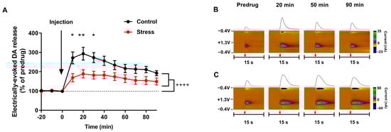 Raclopride (2 mg/kg) had a significantly reduced effect on electrically evoked accumbal dopamine release in rats exposed to social defeat stress. (A) Dopamine efflux following electrical stimulations in the VTA after raclopride administration. Data are presented as mean ± SEM. Control group (n = 8), defeated group (n = 5). Repeated measures two-way ANOVA, * p < 0.05; ** p < 0.01; ++++ p < 0.0001. (B,C) Representative color plots and traces of electrically evoked dopamine release in the brain of anesthetized control (B) and socially defeated (C) rats. Red arrow indicates the onset of electrical stimulation (1 s, 60 Hz, 60 pulses, current 330 µA).