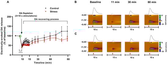 Social defeat stress does not affect dopamine depletion or subsequent release recovery. (A) Electrically evoked accumbal dopamine response taken 1 min (14 stimulations), 5 min (3), and 10 min (5) intervals following application of a series of stimulation pulses designed to deplete dopamine in the stimulated cells (3 × 10 s, 330 µA, 600 Hz, 600 pulses; onset of depletion stimulation pattern indicated by green lines) as a percent of pre-depletion baseline. Data presented as mean ± SEM; (n = 6 per group); **** p < 0.0001 (Repeated measures two-way ANOVA). (B,C) Representative color plots and traces of electrically evoked dopamine release in the brain of control (B) and defeated (C) rats taken 1, 20 and 70 min after dopamine depletion. Red arrow–onset of electrical stimulation.