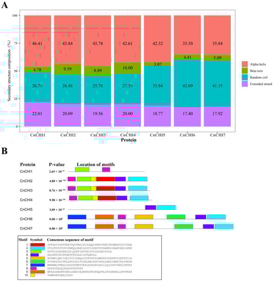 Figure 1. Characteristics of CnCHI protein sequences. (A) Secondary structure composition of CnCHI proteins. (B) Distribution of the conserved motifs in CnCHI proteins. A total of 10 motifs were predicted for each protein using the MEME online analysis software.