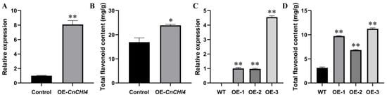 Figure 6. Overexpression of CnCHI4 in C. nitidissma and N. tabacum. (A) Relative expression levels of CnCHI4 in the control (empty vector) and experimental (pCAMBIA1302-CnCHI4) groups in C. nitidissma leaves after transiently transformed. (B) TFC in the control and experimental groups in C. nitidissma leaves after transiently transformed. (C) Relative expression levels of CnCHI4 in the wild-type tobacco plants and plants overexpressing CnCHI4. (D) TFC in the wild-type tobacco plants and plants overexpressing CnCHI4. The error bars indicate the SE from three replicates; statistical significance was determined using Student’s t-test (* p < 0.05; ** p < 0.01). WT, wild-type, OE, overexpression.