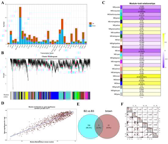 Figure 7. Identification of the transcription factors that regulate CnCHI4 expression. (A) Transcription factors that were differentially expressed between B2 and B3; the red and blue bars represent upregulated and downregulated expression in B3 stage, respectively. ‘Transcription factor’ on the x-axis represents different transcription factor families, and ‘number’ on the y-axis means the number of DEGs detected within each gene family. (B) Hierarchical cluster tree of the co-expressed modules. (C) Correlation between the gene expression modules and the expression level of CnCHI4 at different stages of flower development, the number in the brackets represents significance level. The bar ranging from purple to yellow (−1 to 1) represents negative to positive correlations, respectively. (D) Module Membership and Gene Significance of the genes in the brown module. (E) Venn diagram comparing the genes identified by WGCNA and differential expression analysis. (F) Pearson correlation coefficient between the expression of CnCHI4 and key transcription factors at different stages of flower development. The statistical analysis was performed by R package, PerformanceAnalytics (** p < 0.01; *** p < 0.001).