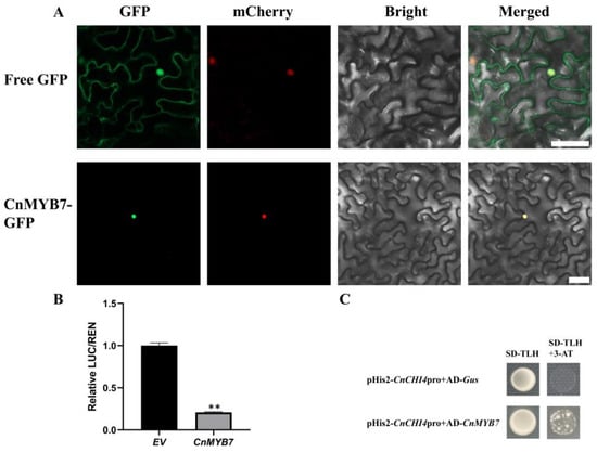 Figure 8. CnMYB7 regulates the expression of CnCHI4. (A) Subcellular localization of CnMYB7 protein in the leaves of N. benthamiana, co-expressed with nucleus-located mCherry. The empty vector was used as the control. GFP: images under green fluorescence channel; Bright: images under bright light; mCherry: images under red fluorescence channel; Merged: overlay plots. Bars = 50 μm. (B) Dual-luciferase reporter assay analyses the regulatory effects of CnMYB7 on the promoter of CnCHI4. The SE was determined from three replicates, and statistical significance was determined by Student’s t-test (** p < 0.01). (C) Yeast one-hybrid analyses of the interaction between CnMYB7 and the promoter of CnCHI4.
