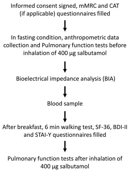 All subjects were recruited (mean age 67.6 years ± 8.4 SD; 22 F, 29 M) in a period of 12 months and included 25 patients with COPD (20% GOLD STAGE 1; 60% GOLD STAGE 2; 20% GOLD STAGE 3) and 26 healthy matched subjects (controls). COPD patients were derived from outpatient pulmonary service at the National Research Council (CNR), a secondary care referral center in Palermo, Italy. The diagnosis of COPD was based on clinical history and a post-bronchodilator forced expiratory volume in the first second (FEV1)/forced vital capacity (FVC) ratio lower than 0.70. The classification of COPD severity followed the GOLD (Global initiative for Chronic Obstructive Lung Disease) guidelines (2022 Report; available from: https://goldcopd.org/wp-content/uploads/2021/12/GOLD-REPORT-2022-v1.1-22Nov2021_WMV.pdf) (accessed on 15 November 2022). All patients with COPD were in a stable state at study entry: no exacerbation history in the last three months that required a change in medication or hospital admission. None of the patients were undergoing long-term oxygen therapy. Healthy control subjects were matched by age and BMI, keeping the sex distribution not significantly different between COPD and control subjects. Controls exhibited an FEV1/FVC ratio ≥ 0.70 and a FEV1 ≥ 80% of the predicted value. Subjects with a known malignant tumor, with orthopedic, neurologic or unstable cardiac diseases, active inflammatory disease (such as asthma, bronchiectasis or other non-COPD-related disease), decreased comprehension due to conditions such as dementia, or severe mental or physical disabilities that might interfere with the results were excluded. Smoking status included: never smokers (<100 cigarettes in a lifetime), former smokers (quit > 12 months before data collection), and current smokers (quit < 12 months before enrollment) or currently still smoking ≥ 10 cigarettes/day for the past year). Smoking pack years were defined by multiplying the number of packs of cigarettes (1 pack = 20 cigarettes) smoked per day by the number of years smoked; years of smoking were directly garnered during the assessment. For the aims of the present work, current and former smokers were pooled together. Data were collected from structural interviews, clinical examinations, laboratory investigations, and measurements of physical parameters. The procedures of the study included the following: (1) patient’s medical record: age, race/ethnicity, average number of COPD exacerbations per year (based on data within the last two years), smoking history (current or past and pack-years), past medical history, current medications, comorbidities, and hospitalization evaluations; (2) pulmonary function by spirometry test; 3) venous blood samples collection; (4) body composition assessment by bioelectrical impedance analysis (BIA); (5) 6 min walking test (6MWT) (6); administration of the following questionnaires: the 36-item Short Form Survey (SF-36), the Modified British Medical Research Council questionnaire (mMRC), the COPD Assessment Test (CAT), the Beck’s Depression Inventory–II (BDI–II), and the State-Trait Anxiety Inventory-Y (STAI-Y) questionnaires which were evaluated from GPs’ files. A patient card containing any history of hospitalizations and possible comorbidities was provided by a general medical practitioner to the interviewer for each patient that provided consent for all the procedures. The chronic medical conditions for all patients enrolled in the study were compiled and counted, including those grouped into cardiovascular or respiratory diseases. The study fulfilled the criteria of the reference Ethics Committee of Policlinico-Giaccone Hospital, Palermo, Italy (No. 10/2013, 18 September 2013) and was in agreement with the Helsinki Declaration. All subjects gave their written informed consent. The individual privacy of clinical data was guaranteed under Italian law. The complete sequence of data collection from the subjects who participated in the study is depicted in the flow chart of Figure 1.