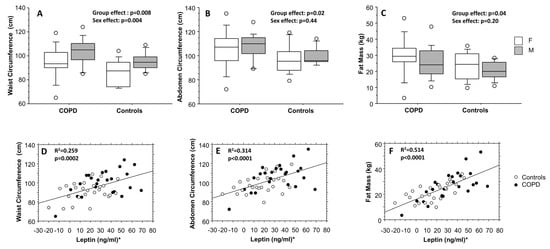 Waist circumference (A), abdomen circumference (B), and fat mass (C), separately for COPD and control groups and sex. Results from two-way analysis of variance. For each box plot, from the bottom to the top, horizontal lines display the 10th, 25th, 50th (median), 75th, and 90th percentiles of the values. Values below 10th percentile and above 90th percentile are plotted as circles. For both COPD and control groups, linear positive correlations between waist circumference (D), abdomen circumference (E), and fat mass (F) and leptin values. * Leptin values were normalized by mean and standard deviation.