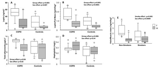 Leptin, leptin normalized for fat mass (leptin/fat mass ratio), and total adiponectin were significantly higher in COPD than in controls, both for categories (p = 0.003, p = 0.001, and p = 0.04, respectively) and for sex effects (significantly higher in females than in males, p = 0.007, p < 0.0001, and p = 0.02, respectively) (Table 2, Figure 3A–C). Haptoglobin was significantly higher among COPD subjects than in controls (p = 0.006), only for group effect but not for sex effect (Figure 3D). Irisin, irisin normalized for muscle mass (irisin/muscle mass ratio), and I-FABP were not significantly different between the two evaluated groups. Lastly, irisin/muscle mass ratio was significantly higher among non-smokers than in smokers (p = 0.045), and in females than in males (p = 0.0009) (Figure 3E).
