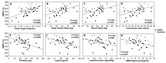 For both COPD and control groups, linear positive correlations between 6MWT and phase angle (A), body cellular mass (B), muscle mass (C), and intracellular water (D), linear inverse correlations between 6MWT and fat mass (E), leptin (F), leptin/fat mass ratio (G), HMW adiponectin (H). * Leptin, leptin/fat mass ratio, and HMW adiponectin values were normalized by mean and standard deviation.