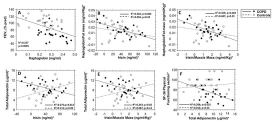 For both COPD and control groups, inverse correlations between FEV1 (as percent of predicted) and haptoglobin (A). Separately for COPD and control groups, inverse correlations between haptoglobin/fat mass and irisin (B), haptoglobin/fat mass and irisin/muscle mass ratio (C), total adiponectin and irisin (D), total adiponectin and irisin/muscle mass (E), Physical Functioning section of SF-36 questionnaire and total adiponectin (F). * All the variables in panels (B–F) were normalized by mean and standard deviation.