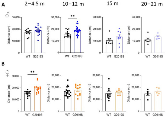 Male and female WT and G2019S mice were examined for possible locomotor impairment in the open field test at four different age ranges: 2–4.5 months (young adult), 10–12 months (middle-aged), 15 months (upper limit of middle age), and 20–21 months (old) [22]. Male G2019S mice aged 10–12 months displayed hyperlocomotion as shown by a significant increase in the total distance covered in the arena during the 60 min duration of the test (Figure 1A). Hyperlocomotion was also observed in female G2019S mice but at a younger age range (2–4.5 months, Figure 1B). Locomotion was unaltered in the other age ranges in both male and female mice.