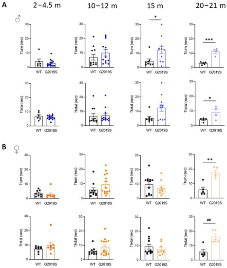 We assessed motor coordination with the pole test. Male and female G2019S mice aged 2–4.5 months and 10–12 months performed comparatively to their WT littermates (Figure 2). At 15 months, male G2019S mice displayed an increased time to turn downward (Tturn) from the top of the pole, which persisted in 20–21 months old mice (Figure 2A). Female G2019S mice also showed increased Tturn, but only at 20–21 months of age (Figure 2B). The total time taken to descend the pole (Ttotal) was significantly increased in both male and female 20–21 months old G2019S mice (Figure 2). These results show that male and female G2019S mice display impaired fine motor behavior as they become old and that these deficits occur later in female mice compared to male G2019S mice, demonstrating the slow, progressive, sex-dependent onset of motor deficits.
