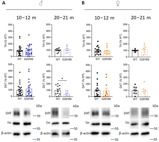 Old male G2019S mice display decreased DAT amount in the striatum. Western blotting of TH and DAT in the striatum of 10–12 months old and 20–21 months old male (A) and female (B) WT and G2019S mice. N = 4–25 mice in each group. * p < 0.05 unpaired Student’s t-test.
