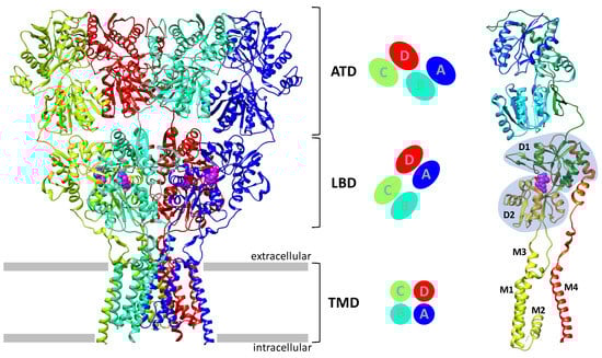 Similar to other ionotropic glutamate receptors, the AMPA receptor is a tetrameric protein consisting of four subunits that form a cation channel (Figure 1). Each subunit consists of the extracellular amino-terminal domain (ATD), the ligand-binding domain (LBD) containing an agonist binding site (the term “agonist binding domain”, ABD, although more precise, is not yet commonly used), the transmembrane domain (TMD) that forms the ion channel pore, and the intracellular C-terminal domain (CTD) [3,14,15]. The transmembrane domains form a symmetrical tetramer, while the ligand-binding and amino-terminal domains have the structure of a dimer of dimers, with different topologies of contacts between their subunits.