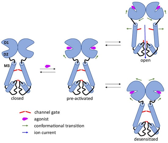 Over the past few years, significant progress in understanding the mechanism of operation of the AMPA receptor and, in particular, the opening and closing of the ion channel, has been made. These results are driven primarily by the development of X-ray crystallography and cryo-electron microscopy methods, which made it possible to determine a number of complete receptor structures simulating their various states and to analyze their conformational differences [15,25]. A simplified scheme of the processes occurring upon binding of an agonist to the receptor is shown in Figure 2. A key role in the receptor gating is played by the ligand-binding domain that is shaped as a clamshell, inside of which (between the D1 and D2 lobes) the agonist binding site is located. In an unbound receptor in the closed (resting) state, the M3 transmembrane helices are drawn together, closing the channel pore. When an agonist binds, the clamshell partially closes due to the shift of the D2 lobe towards the D1 lobe, and the receptor is transferred to the pre-activated state, in which the channel is still completely closed. As the D2 and D1 lobes are further drawn together during the clamshell closing, while maintaining the interaction of the “back” parts of the clamshells in the dimer, this causes substantial separation of the D2 lobes leading to the strain of the linkers between the LBD and TMD, and, as a result, the separation of the M3 transmembrane helices from each other and the opening of the channel gate. When the agonist is unbound, the receptor is transferred from the pre-activated state to the closed state.