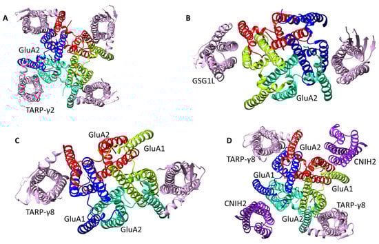 Representative examples of experimentally determined structures of AMPA receptor complexes with auxiliary subunits. (A) GluA2 + 4 TARP-γ2 (PDB: 5VOT), (B) GluA2 + 2 GSG1L (PDB: 5WEM), (C) GluA1/2 + 2 TARP-γ8 (PDB: 6QKZ), (D) GluA1/2 + 2 TARP-γ8 + 2 CNIH2 (PDB: 7OCA).