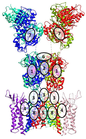 Compared to the NMDA receptor, fewer ligand binding sites are known for the AMPA receptor [2,3]. They are briefly described below, and their approximate locations are shown in Figure 4.