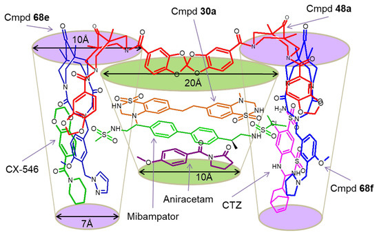 From the structural perspective, reflecting the overall symmetry of the dimeric AMPAR ligand-binding domain, the positive allosteric modulator binding site has a symmetrical structure, including the central and two side pockets, and molecules of quite different sizes and chemical structures—from small nootropic compounds (for example, aniracetam 17) to rather large and complex ones—can bind in its various regions (Figure 5) [7]. Perhaps this is one of the reasons that hinder the development of general principles of PAM molecular design, despite the structure–activity relationships found in individual series of compounds, the vast available experimental data on the structure of the modulator–receptor complexes (recently analyzed in deep detail [75]), and the success of molecular modeling using pharmacophore analysis, 2D and 3D QSAR studies, molecular docking, and molecular dynamics [2,76,77,78,79].