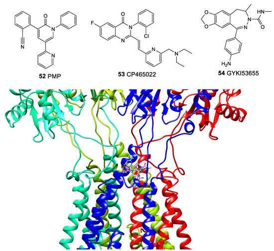 Classical chemotypes of negative allosteric modulators of the AMPA receptor are 2,3-benzodiazepines and quinozalin-4-one derivatives. The binding mode and the mechanism of action of such modulators, using CP465022 (53), GYKI53655 (54), and perampanel as an example, were analyzed in detail by means of the X-ray diffraction analysis, site-directed mutagenesis, molecular and quantum mechanics, molecular docking, and molecular dynamics [141,142,143,144]. All these modulators bind in the interface region of the transmembrane domain (Figure 10). The large size and flexibility of the binding site “pocket”, which is able to adapt to different structures and orientations of the ligands, leads to the binding of modulators with significantly different structures in the same site. Modulator molecules play the role of “wedges” between the transmembrane segments, preventing the M3 helix from shifting when the channel opens. The binding occurs due to multiple weak interactions including hydrophobic contacts, π-stacking, and hydrogen bonds. At the same time, the interaction with certain amino acid residues depends on the state of the receptor, and the significance of some interactions remains debatable.