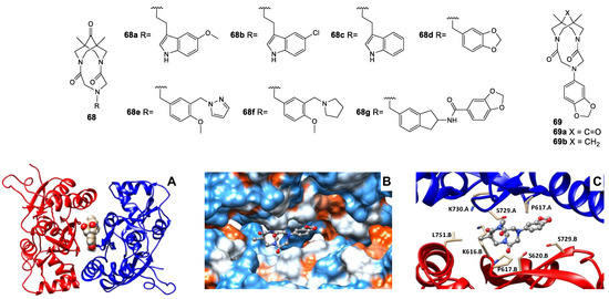Although the derivatives and analogs of benzothiadiazine dioxide, starting with cyclothiazide (CTZ 26), represent one of the most thoroughly researched classes of the AMPAR positive allosteric modulators, their studies continue to attract considerable interest. During the search for new chemotypes of modulators and the investigation of their structure–activity relationships, a number of highly potent structures were found, for example, 27 [98], 28a and its unsaturated metabolite with comparable activity 28b [99]. In some cases, the “unexpected” structure–activity relationships discovered during the study could be explained using thermodynamic analysis, experimental data on the binding modes, and molecular modeling [100,101]. Unlike most of the studied benzothiadiazine dioxides, which admit independent binding of two modulator molecules in different regions of the binding site at the LBD dimer interface, the larger molecules of the phenoxy derivative 29 [102] and the specially designed dimeric compounds 30 [76] occupy several regions of the site by binding of one molecule (Figure 6B) and exhibit activity in the nanomolar range.