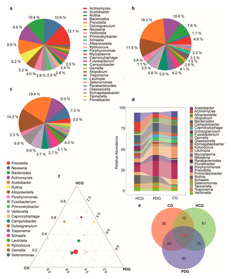 Oropharyngeal bacterial alterations among HCG, PDG, and CG. Average compositions of relative abundance of the top 20 bacterial genera for (a) HCG, (b) PDG, and (c) CG. (d) Alterations in the top 20 bacterial genera among the three groups. (e) The shared and unique genera of the three groups. (f) Ternary plots depicting the 244 shared genera of the three groups. The sum of the proportion for one specific bacterium in the three groups was set to 1, and the proportion of one specific bacterium in each group is equal to its corresponding relative abundance divided by the relative abundance sum of these bacteria in the three groups. The sizes of the circles represent the relative abundance of the genus. HCG: healthy control group. PDG: period of disease group. CG: convalescent group.