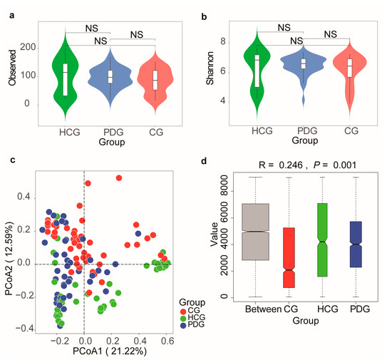 Then, we analyzed the alterations in the alpha and beta diversities among the HCG, PDG, and CG. Consequently, the PDG and CG showed a lower, but non-significant, alpha diversity than the HCG, as illustrated by the Observed index, Shannon index (Figure 4a,b; p > 0.05), Chao1 index, and Simpson index (Supplementary Figure S1a,b; p > 0.05). The result of beta diversity showed that the PDG was slightly separate from the HCG and that the CG was slightly separate from the HCG and the PDG (Figure 4c). The ANOSIM plot showed that the intergroup difference was greater than the intra-group difference (Figure 4d, R = 0.246, p = 0.001).