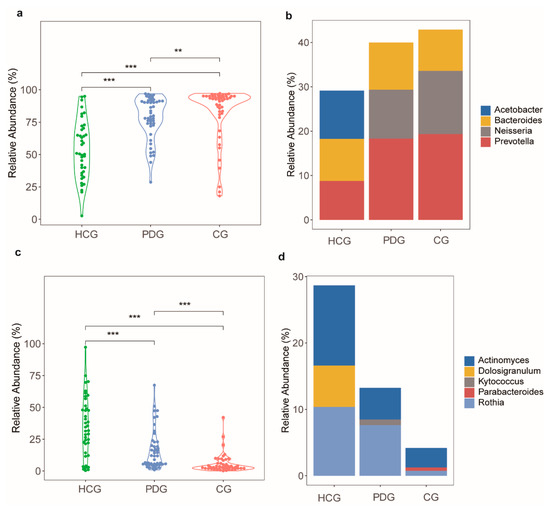 Alterations in Gram-negative and Gram-positive bacteria among HCG, PDG, and CG. (a) The relative abundances of Gram-negative bacteria in PDG and in CG were significantly greater than that in HCG, (b) and the major bacterium contributing to this was Prevotella. (c) The relative abundance of Gram-positive bacteria in PDG and in CG was significantly smaller than that in HCG, (d) and the major bacteria contributing to this were Rothia and Actinomyces. The p-values were confirmed by the Wilcoxon rank-sum test. HCG: healthy control group. PDG: period of disease group. CG: convalescent group. p-values of < 0.01**, and < 0.001*** were considered statistically significant.