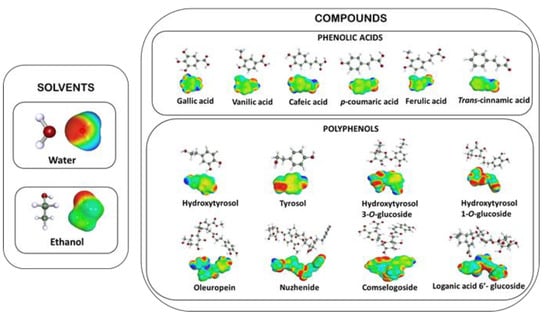 In this work, the COSMOthermX program (version C30 release 13.01, Leverkusen, Germany) was used for all the calculations. Hydroalcoholic mixtures of EtOH/H2O with a variation of the ethanol percentage from 0 to 100% with an increment of 10% were modeled. Calculations were conducted at temperatures of 20 °C and 50 °C for each mixture. After an exhaustive literature review, solute selection was based on the major polyphenols detected in olive pomace [].