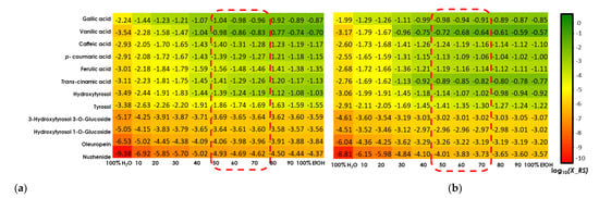 Figure 3a,b (20 °C and 50 °C) show the relative solubility values (log10(x_RS)) of investigated polyphenols in different ethanol/water mixtures. The best extraction solvent for the majority of solutes was found to be 100% of ethanol, which is therefore taken by the software as a reference; it then gives all the other solvents relative to it. The different colors, shown in the table of COSMO-RS results, provide information on the relative solubility of phenolic compounds in the solvent mixture. Green values represent a higher solubility index (0 to −1) compared to the other EtOH/H2O ratios in the solvent system, yellow values stipulate a medium solubility index (−1 to −4) relative to that of the reference solvent, while red values indicate a very low solubility index (<−4). According to Figure 3a,b, it can be noticed that the solubility index of all investigated phenolic compounds is improved by increasing the temperature. Indeed, the range of green values was extended to (30:70) of EtOH/H2O at 50 °C (Figure 3b) compared to that at 20 °C (40:60 of EtOH/H2O) (Figure 3a).