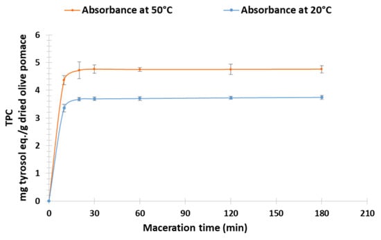 To determine the optimal extraction conditions, the extraction duration was evaluated as a function of TPC obtained by CM with EtOH/H2O ratio (60:40) as solvent for temperatures of 20 °C and 50 °C. Kinetic monitoring shows similar profiles (Figure 4). However, the comparison of extraction yields shows that the temperature influences the yields according to the prediction of COSMO-RS. The maximum yields obtained are 3.75 ± 0.07 mg TE/g DOP at 20 °C and 4.76 ± 0.13 mg TE/g DOP at 50 °C after 20 min of maceration.