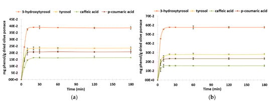 Kinetic of dried olive pomace extraction at 20 °C and at 50 °C: UPLC 20 °C (a), UPLC 50 °C (b).