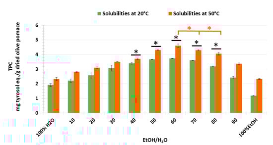 TPC extracted from olive pomace by CM with variation of EtOH/H2O ratio from 0 to 100% at 20 °C and at 50 °C; *: p ≤ 0.05.